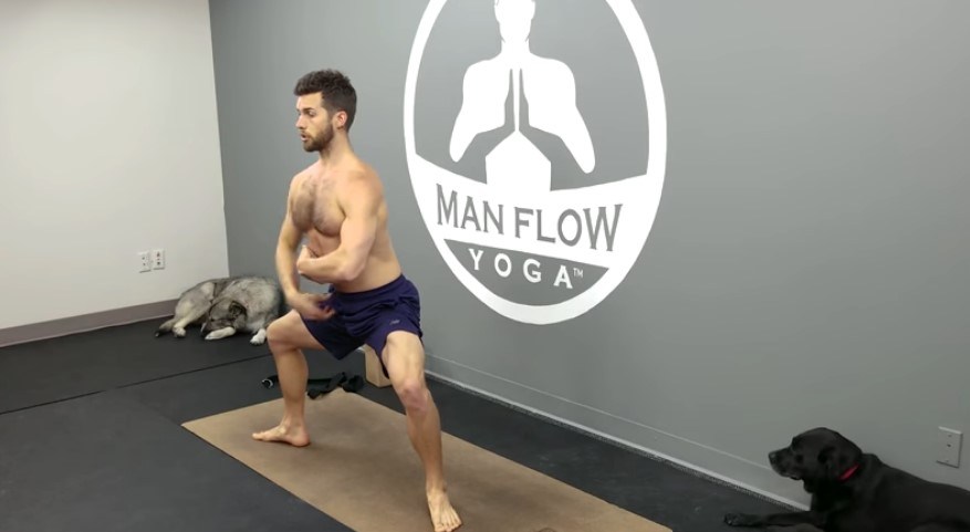 Raise your arms above your head, and your arms should be parallel to each other and no wider than shoulder width apart. Inhale deeply and then exhale as you bend your left knee. Then lift your torso and flex your stomach muscles.